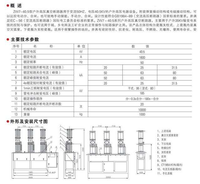 ZW7-40.5系列户外高压真空断路器是三相交流50hz,额定电压40.5ky的户外高压电气设备,配有弹簧操动部门或电磁操动部门,可远程支配电气开合,设计性能相符GBI984―89《交流高压断路器》国家标准的要求,并相符IEC-56《交流高压断路器》国际电工委员会标准化的要求。